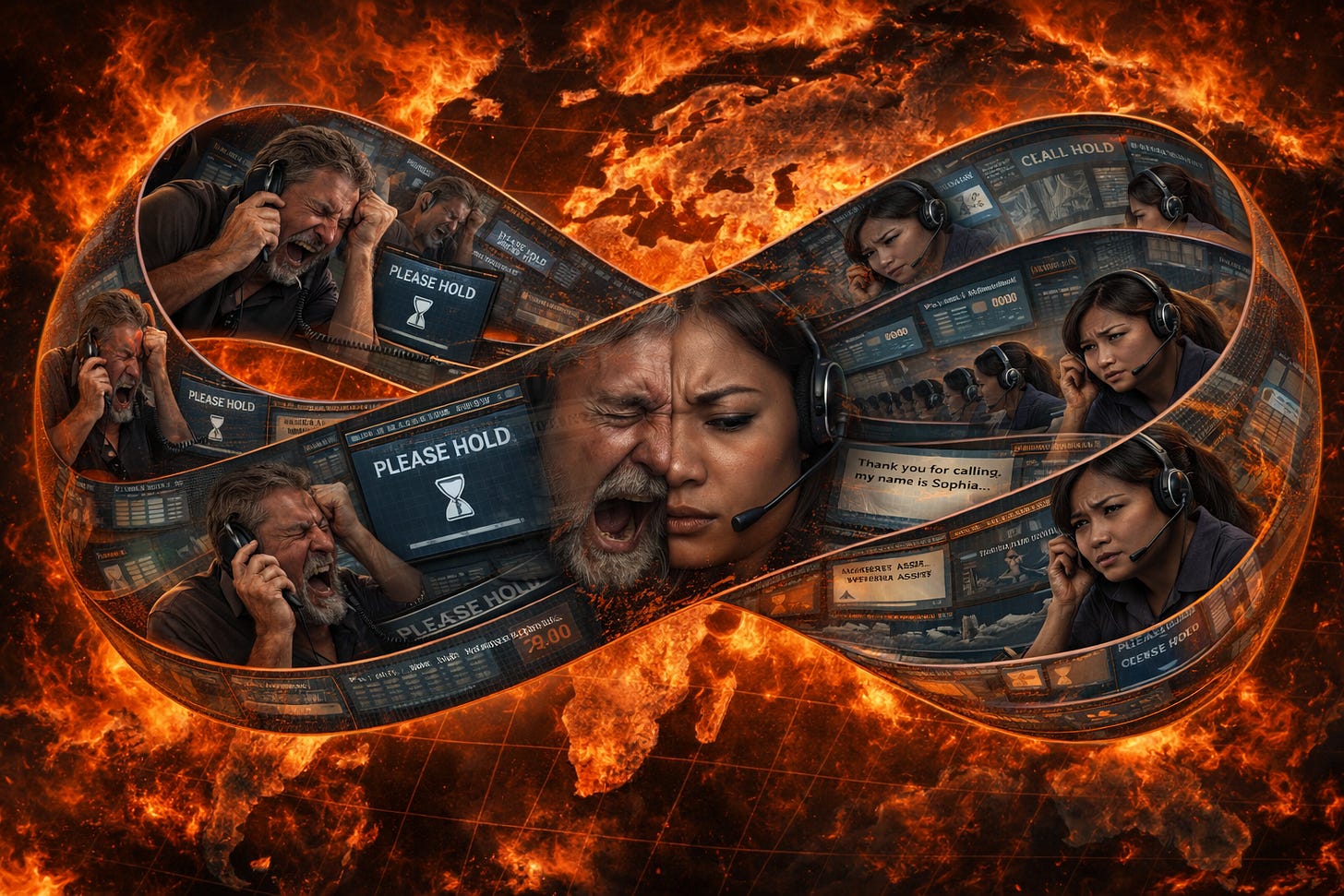 Eventually, you’re transferred to a real person, someone oceans away, armed with nothing but a rigid, pre-approved script, the terrified hope of a positive survey, and the brutal dissonance between their call center’s fluorescent-lit reality and the suburban kitchen in which you probably sit, fuming.